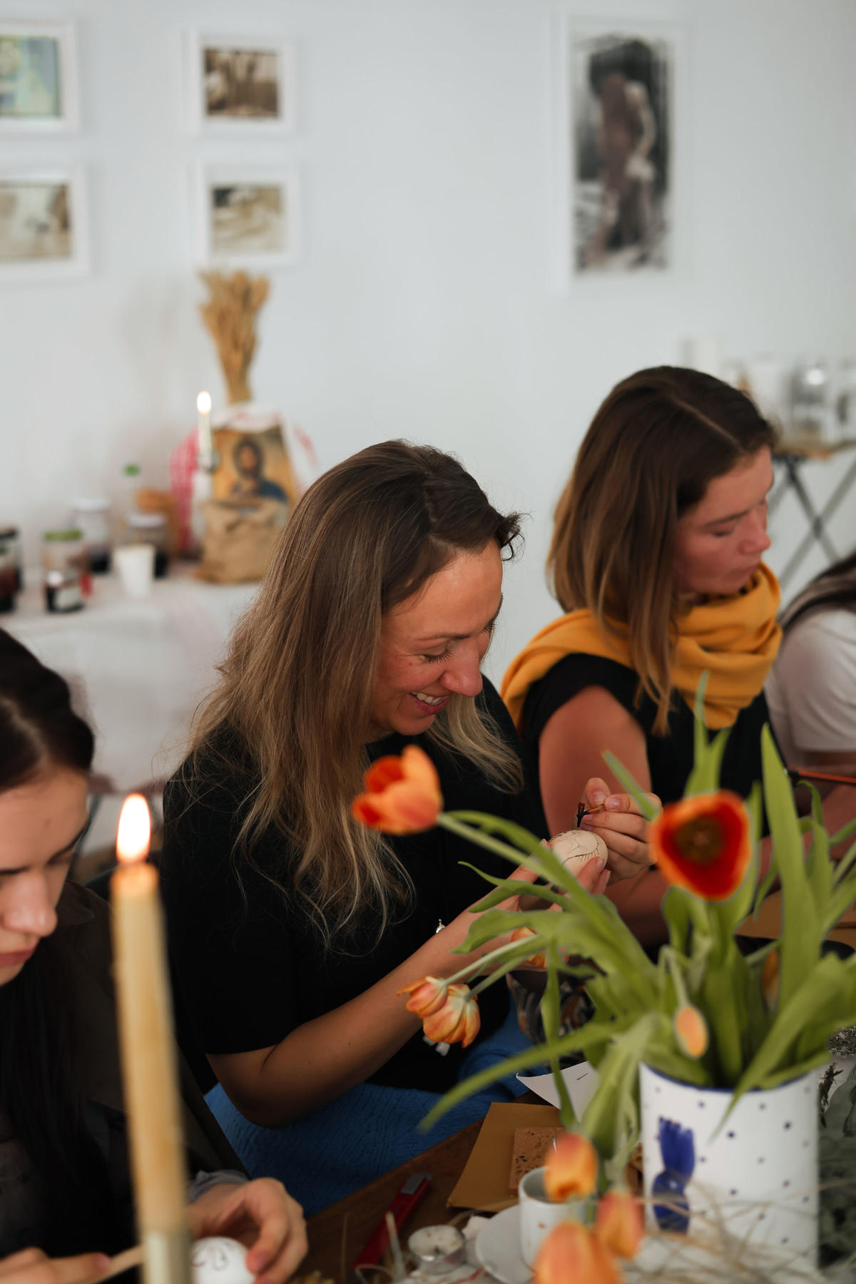 Майстерки провела художниця, очільниця Фонду — Олена Зарецька. Учасниці працювали в традиційній техніці писанкарства — гарячим воском, використовуючи писачки, барвники, яйця. Для багатьох це був перший досвід створення писанки, однак саме процес — повільний, уважний, медитативний — дозволив кожній долучитися до традиції без попередньої підготовки.
