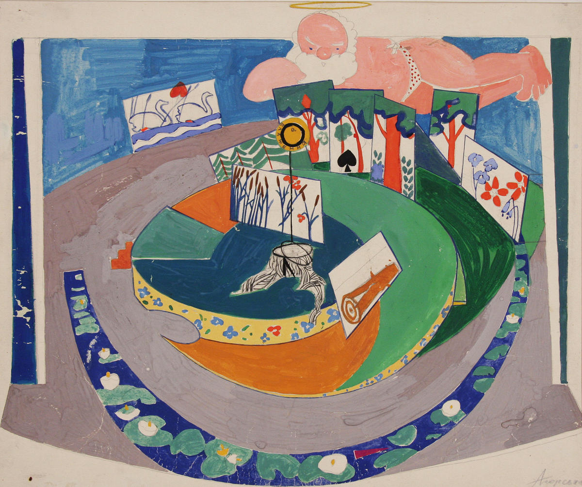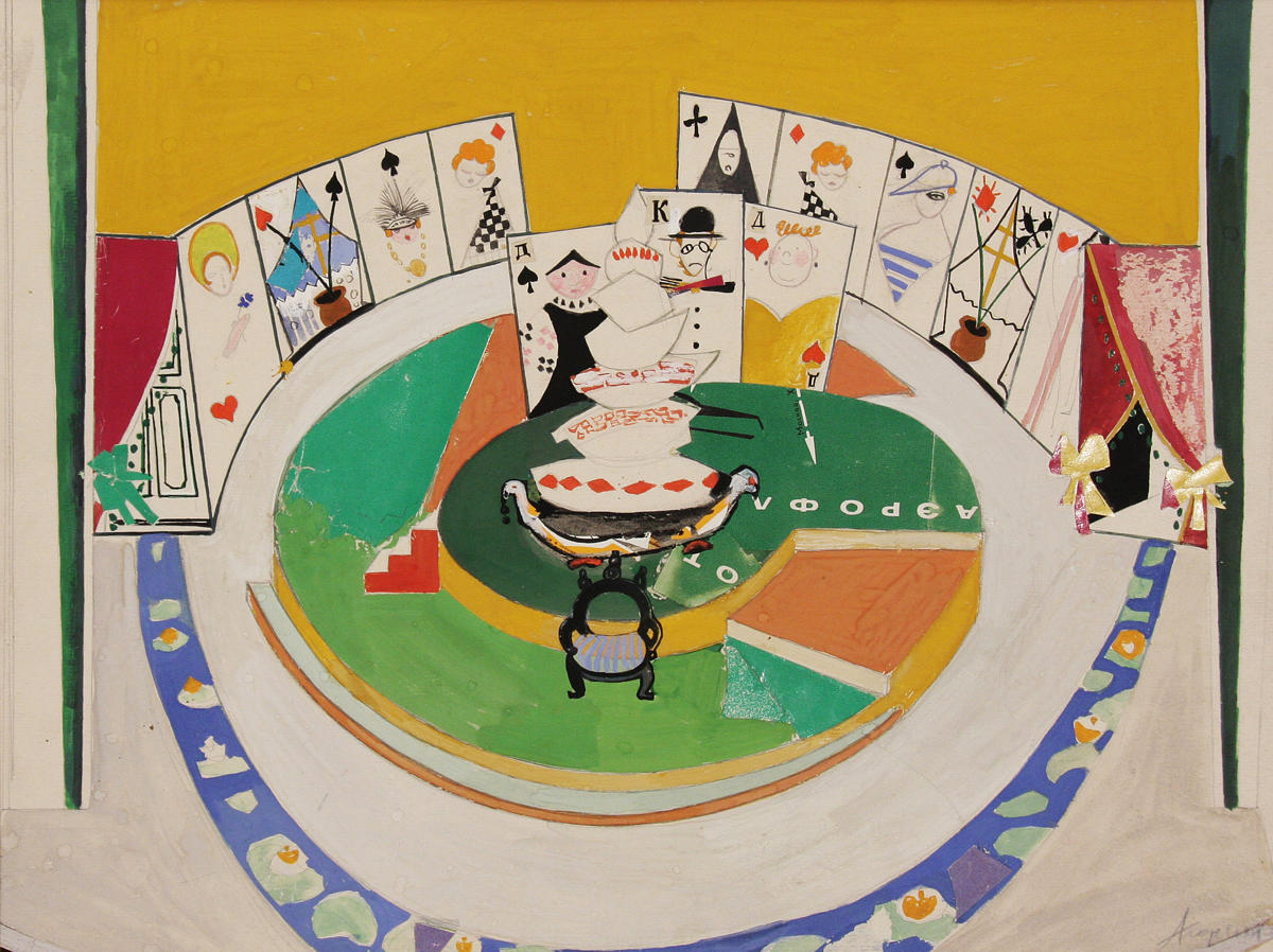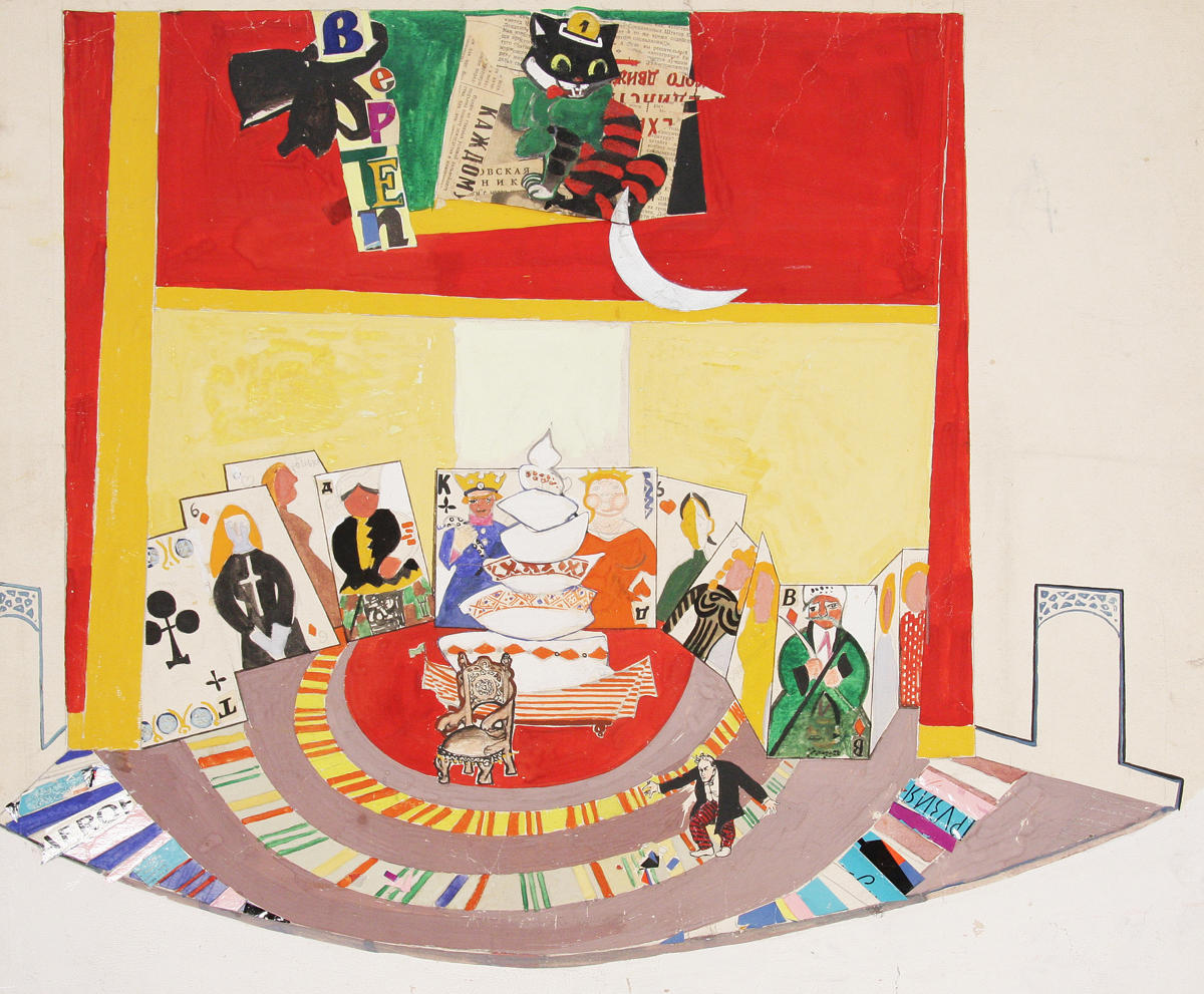 Один з оригінальних сценічних задумів — великі гральні карти, що правили за будівельний матеріал декорації. Зображені на них окремі мотиви, з’єднуючись чи розмикаючись, відтворювали місце дії: то це була кімната Гуски з портретами його численного сімейства; то карти трансформувались в ідилічний пейзаж на острові блаженства.